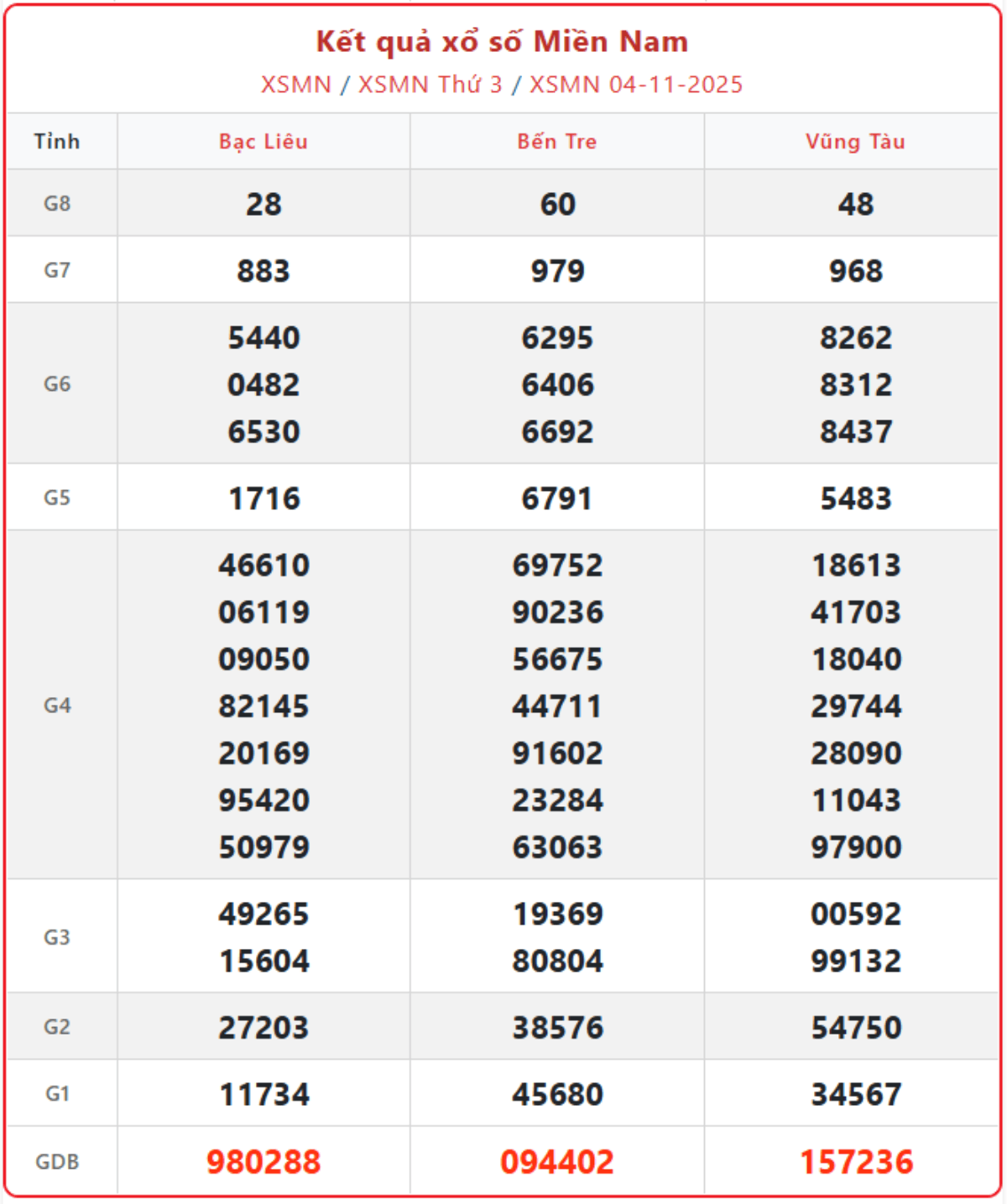 Cập nhật từng giờ xổ số miền Nam ngày 4/11/2025, KQXSMN thứ 3 hàng tuần đầy đủ, chính xác nhất.