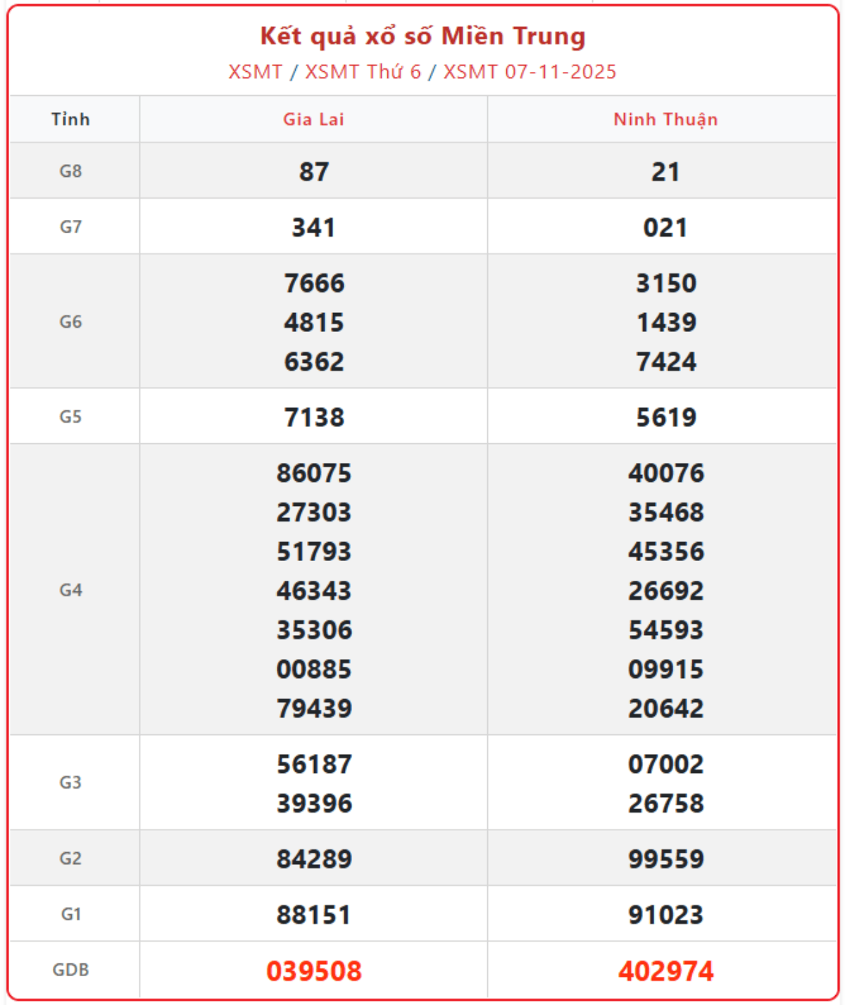 - Thứ Sáu: Kết quả xổ số miền Trung được quay bởi Gia Lai (XSGL) và Ninh Thuận (XSNT).