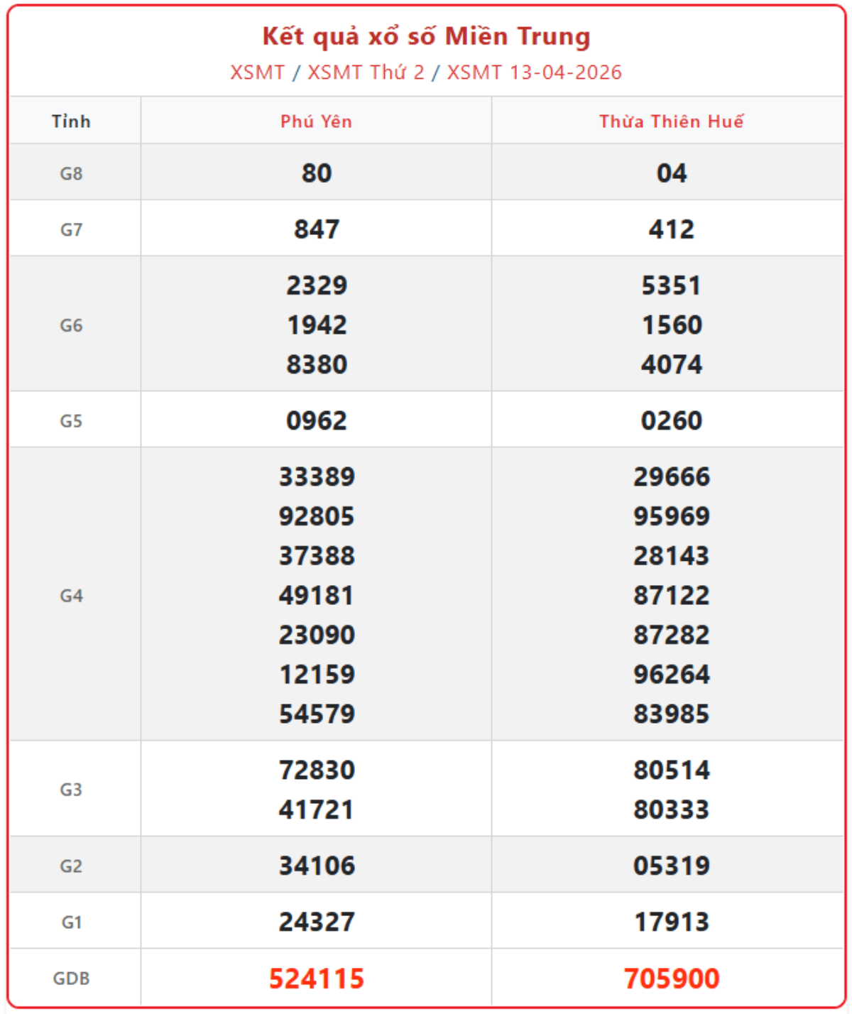 Kết quả xổ số miền Trung ngày 13/4/2026, cập nhật KQXSMT thứ 2 hàng tuần đầy đủ, chính xác nhất.