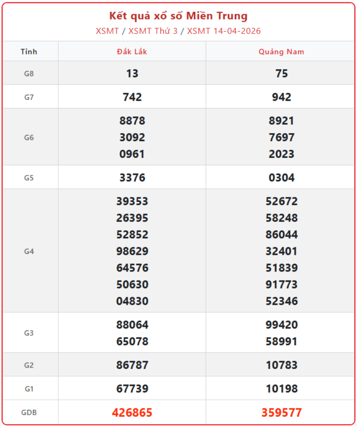 Kết quả xổ số miền Trung ngày 14/4/2026, cập nhật KQXSMT thứ 3 hàng tuần đầy đủ, chính xác nhất.