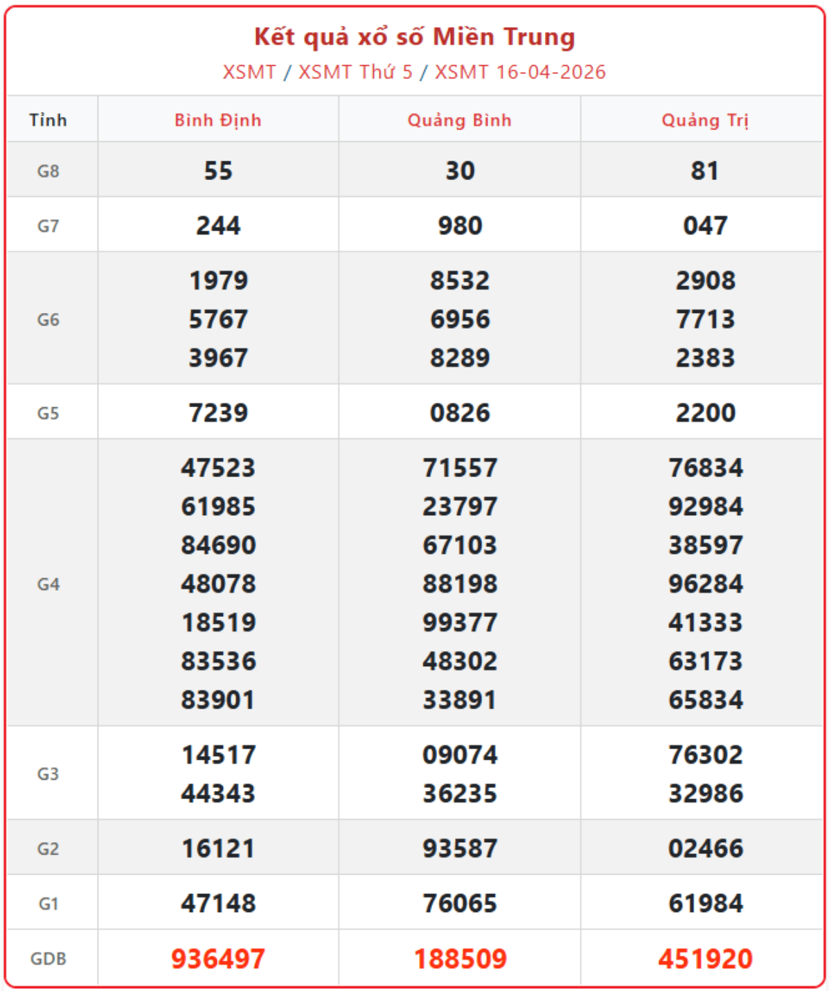 Kết quả xổ số miền Trung ngày 16/4/2026, cập nhật KQXSMT thứ 5 hàng tuần đầy đủ, chính xác nhất.
