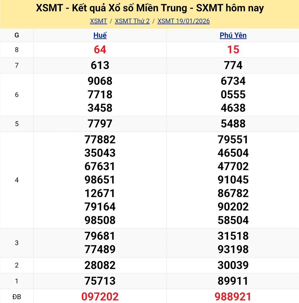 Kết quả xổ số miền Trung ngày 19/1. KQXSMT 19/1/2026. XSMT 19/1.
