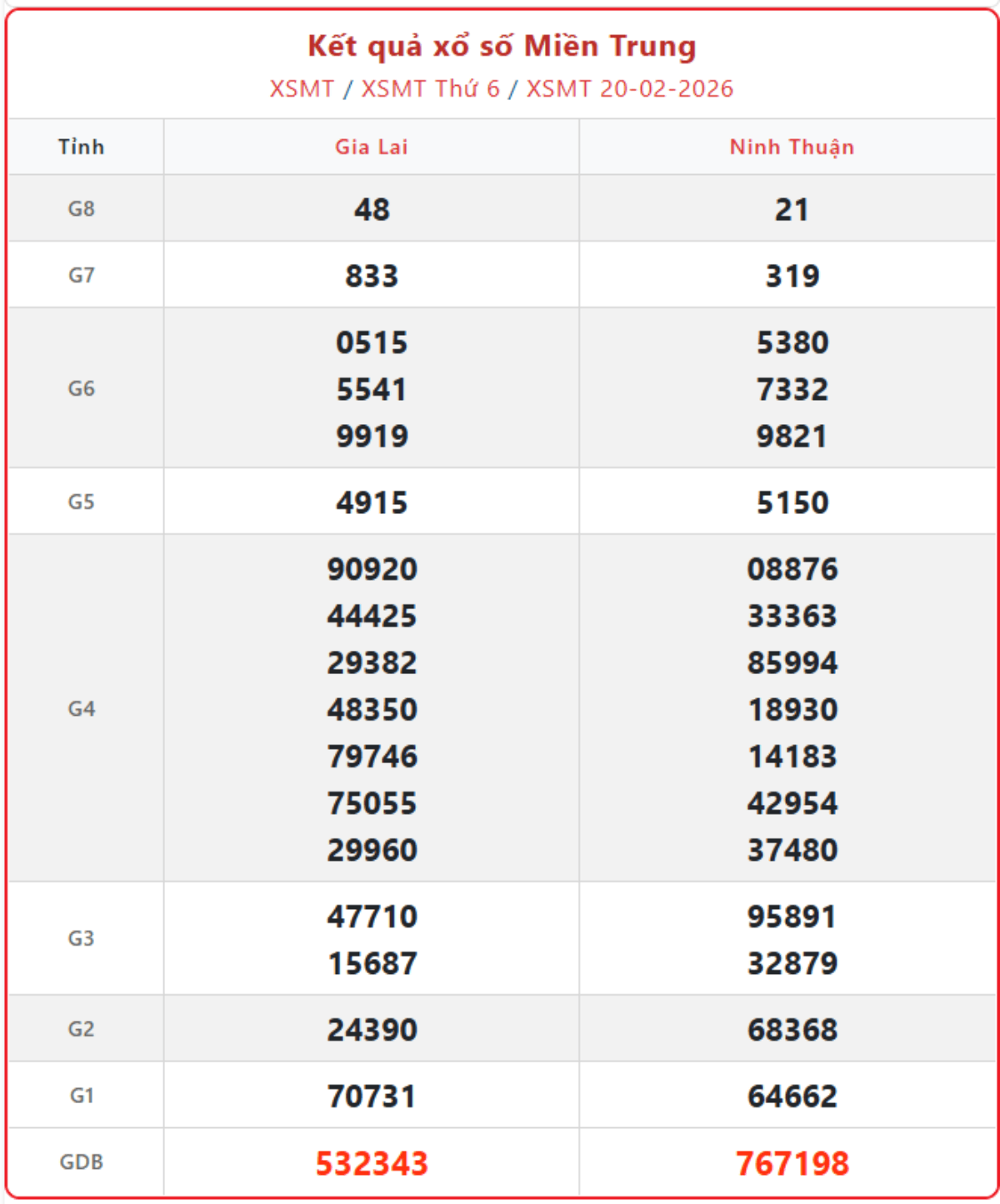 Xem kết quả vé số hôm nay ngày 20/2/2026, cập nhật KQXSMT thứ 6 hàng tuần đầy đủ, chính xác nhất.