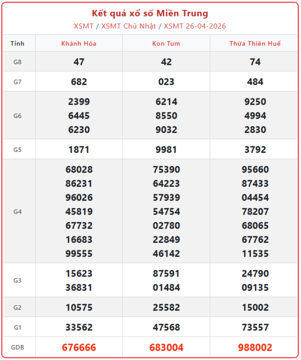 Kết quả xổ số miền Trung ngày 26/4/2026, cập nhật KQXSMT chủ nhật hàng tuần đầy đủ, chính xác nhất.