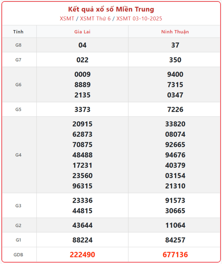 Xem kết quả vé số hôm nay ngày 3/10/2025, cập nhật KQXSMT thứ 6 hàng tuần đầy đủ, chính xác nhất.