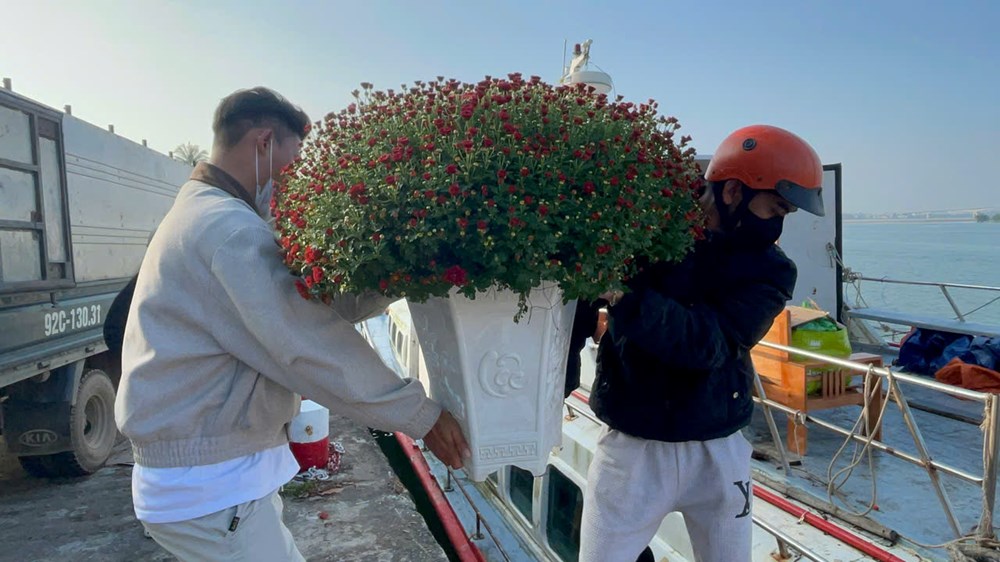Những chậu hoa cảnh rực rỡ được vận chuyển xuống tàu ra đón Tết ở đảo Cù Lao Chàm