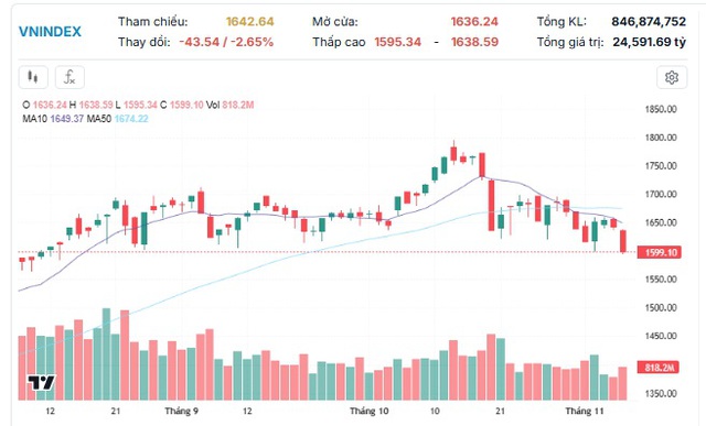 Thị trường Chứng khoán Việt Nam (VN-Index) chịu áp lực bán tăng mạnh trong phiên 7/11, đặc biệt từ nhóm cổ phiếu vốn hóa lớn kéo chỉ số có phiên giảm sâu. VN-Index đóng cửa (-2.65%) tạm thời lùi dưới 1.600 điểm kể từ giữa tháng 08/2025. Các chỉ số còn lại đều giảm sâu với VN30-Index (-2.4%), VNMID-Index (-2.78%). VNSML-Index (-1.51%).