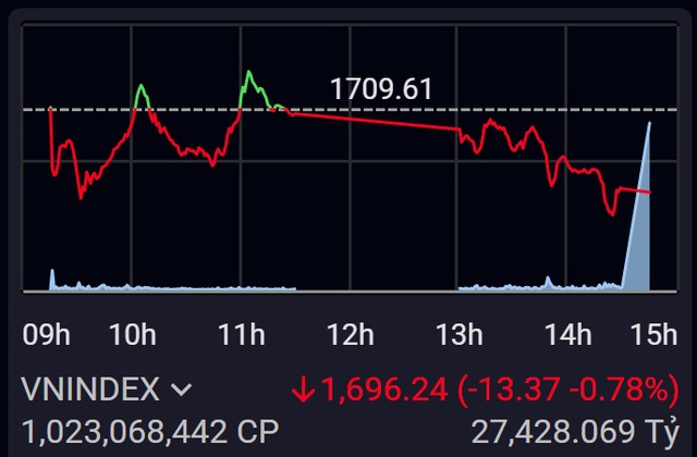 Đóng cửa, chỉ số VN-Index dừng tại 1,696.24 tương ứng (-0.78%), VN30-Index (-0.33%), VNMID-Index (-0.37%), VNSML-Index (-0.02%), HNX-Index (-0.81%), Upcom-Index (0.73%). Giá trị giao dịch cả ba sàn tăng nhẹ so với phiên trước đó.