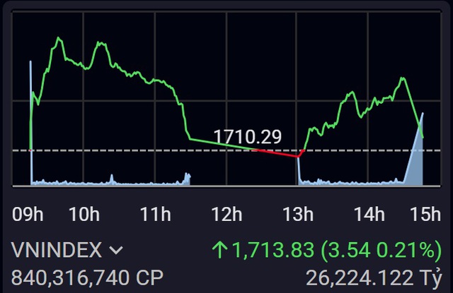 Diễn biến hồi phục tiếp tục sang phiên thứ 2 liên tiếp nhưng các chỉ số phân hóa mạnh. Áp lực ở nhóm vốn hóa lớn và vừa khiến đà tăng bị thu hẹp về cuối phiên. Đóng cửa, chỉ số VN-Index dừng tại 1,713.83 tương ứng (0.21%), VN30-Index (-0.26%), VNMID-Index (-0.1%), VNSML-Index (0.1%), HNX-Index (0.37%), Upcom-Index (-0.52%). Thanh khoản tăng nhẹ so với phiên liền trước.
