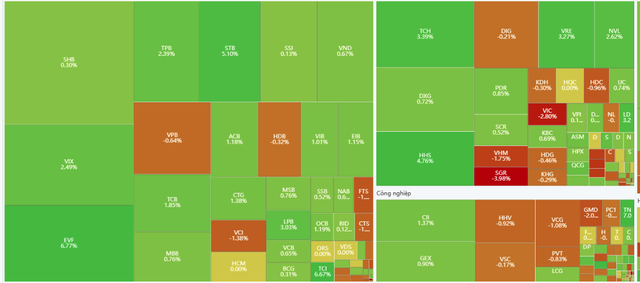 Phiên tăng điểm của thị trường, tuy nhiên độ mở nghiêng nhẹ về sắc đỏ với 12/21 nhóm ngành giảm điểm. Ngân hàng (+1.28%), Bất động sản Khu công nghiệp (+0.66%) và Thép (+0.48%) là ba nhóm ngành tăng điểm mạnh nhất.