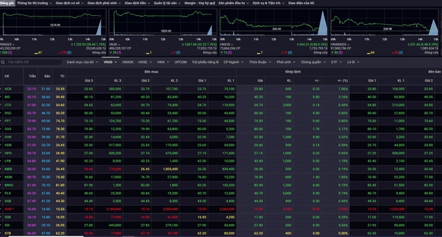 Chỉ số VN-Index đóng cửa (1.7%), VN30-Index (1.76%), VNMID-Index (0.31%), VNSML-Index (0.54%), HNX-Index (0.19%), Upcom-Index (0.95%). Giá trị giao dịch tăng trên HOSE nhưng giảm nhẹ trên HNX.