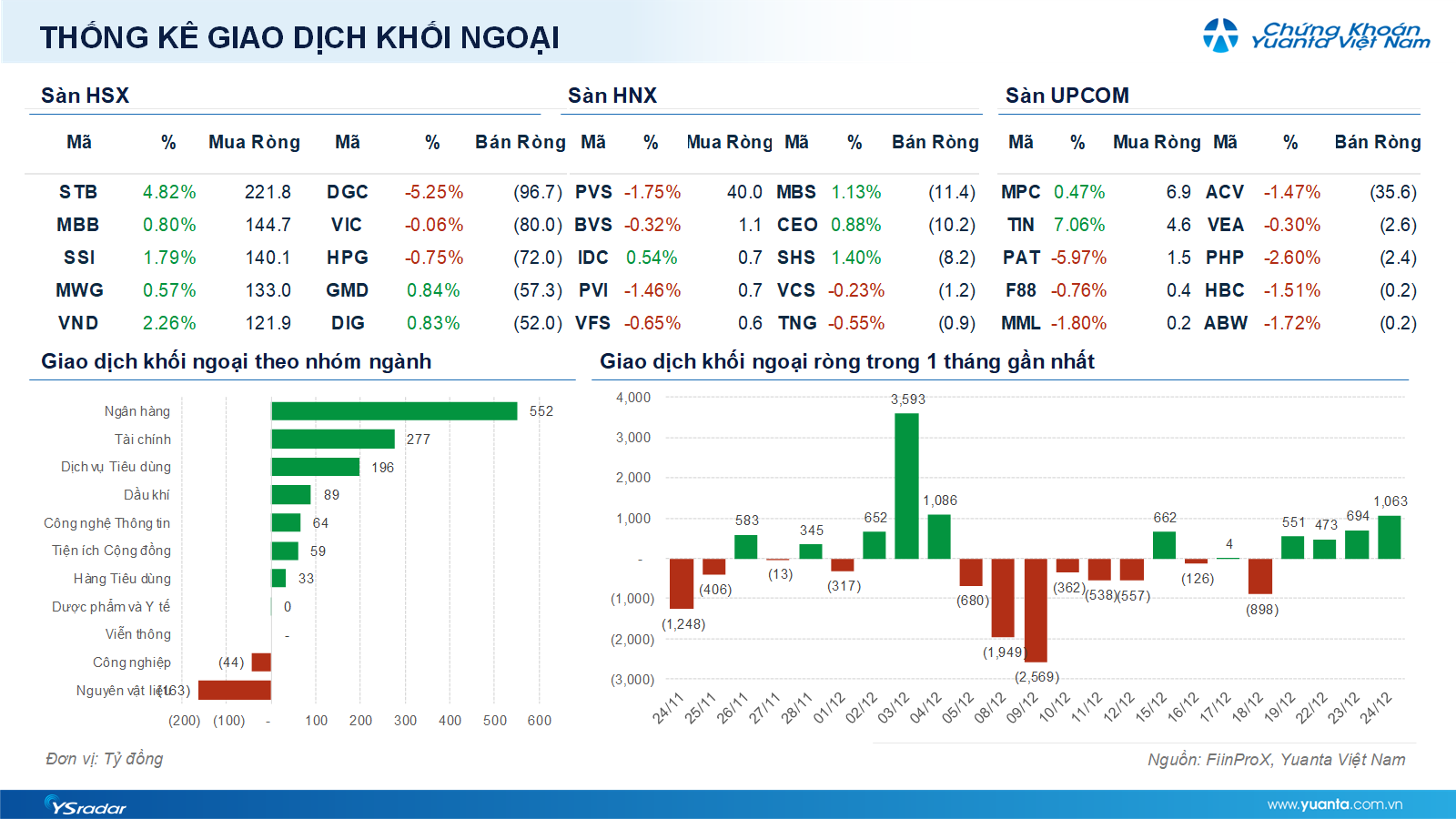 Nhà đầu tư nước ngoài mua ròng phiên thứ 4 giá trị 1063 tỷ đồng tập trung tại STB (222 tỷ), MBB (145 tỷ), SSI (140 tỷ). Ngược lại, DGC (97 tỷ), VIC (80 tỷ), HPG (72 tỷ) là top mã được bán ròng bởi khối ngoại.