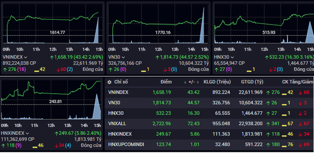 Cụ thể, chỉ số VN-Index đóng cửa (+2.69%), VN30-Index (+2.52%), VNMID-Index (+3.24%), VNSML-Index (+1.89%), HNX-Index (+2.4%), Upcom-Index (+0.82%). Thanh khoản gia tăng trở lại so với phiên liền trước.