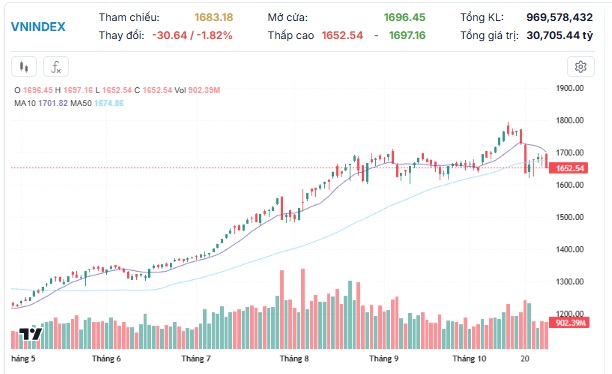 Sắc đỏ chiếm ưu thế khi số mã giảm điểm (178 mã) nhiều hơn so với số mã tăng điểm (143 mã) trên nền thanh khoản khớp lệnh tương đương so với phiên giao dịch trước đó và thấp hơn -14.2% so với mức bình quân 20 phiên. Phiên giao dịch ngày 27/10/2025, VN-Index đóng cửa ở mức 1,652.54, giảm 30.64 điểm (-1.82%).