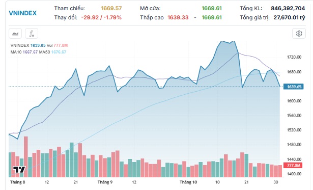 Xu hướng chốt lời gia tăng mạnh sau khi VN-Index tiếp cận mốc tâm lý 1.800 khiến VN-Index sụt giảm (-1.33%) trong tháng 10, hình thành nên xu hướng điều chỉnh khi có 2 tháng giảm điểm liên tiếp.