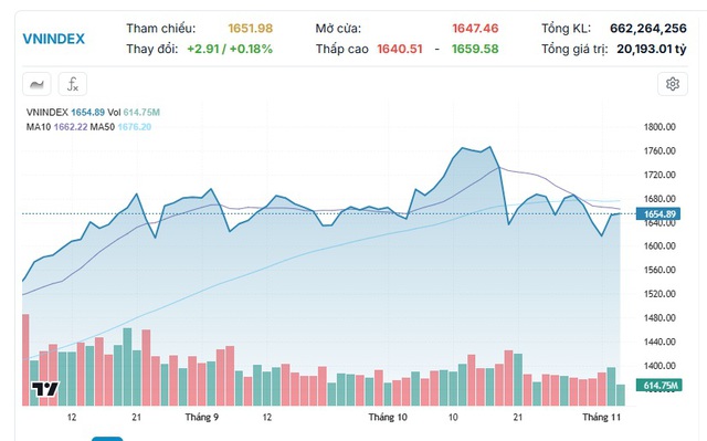 Sắc đỏ có phần áp đảo khi số mã giảm điểm (190 mã) nhiều hơn đáng kể so với số mã tăng điểm (121 mã) và thanh khoản khớp lệnh sụt giảm tới -44.8% so với phiên trước đó. Phiên giao dịch ngày 05/11/2025, VN-Index đóng cửa ở mức 1,654.89, tăng 2.91 điểm (+0.18%).