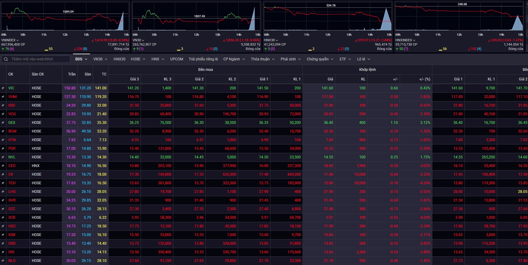 Kết thúc phiên giao dịch, VN-Index đóng cửa tại mức 1.674,99 điểm, giảm 9.05 điểm, tương đương 0.54%.