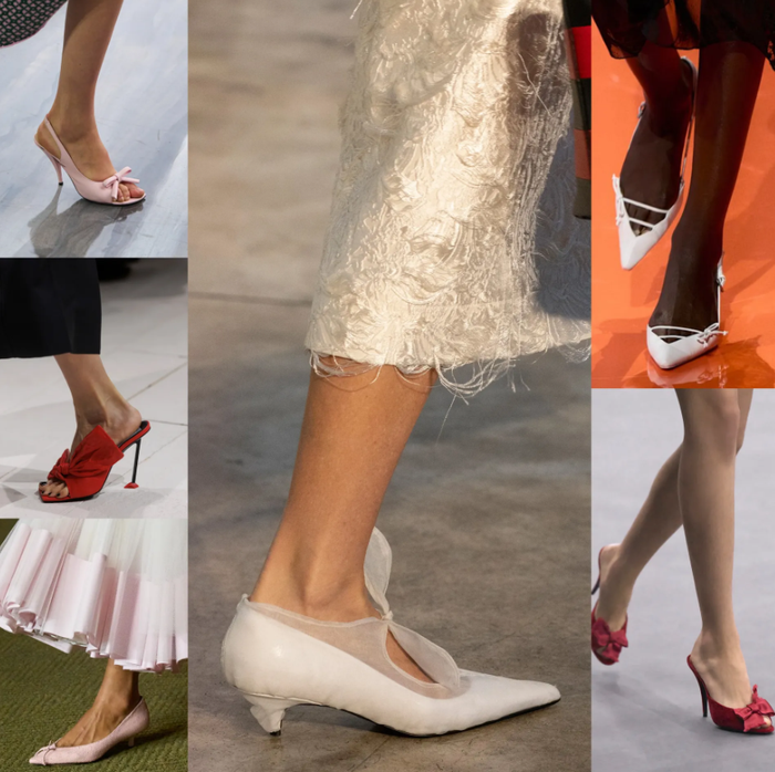 Chi tiết nơ tiếp tục được lăng xê mạnh mẽ. Vốn là biểu tượng của sự nữ tính và duyên dáng, nơ gần như không chịu ảnh hưởng bởi vòng xoáy xu hướng. Các mẫu giày cao gót mũi nhọn đính nơ mang đến cảm giác ngọt ngào nhưng vẫn thanh lịch. Prada giới thiệu thiết kế gót thấp màu trắng tinh tế, phù hợp môi trường công sở. Trong khi đó, Dior tạo dấu ấn với gam hồng dịu dàng, dễ phối cùng quần bò hoặc váy hoa mùa xuân.