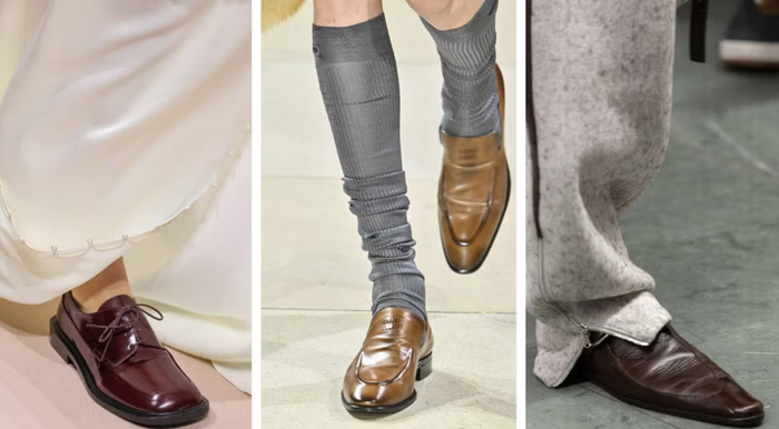 Trong khi đó, Miu Miu lại nhấn mạnh yếu tố trẻ trung bằng tất lộ và các lớp len mềm. Tory Burch cũng giới thiệu phiên bản mũi vuông bằng da trơn, hiện đại và sắc nét. Đây là lựa chọn lý tưởng cho những ngày đông bạn muốn một đôi giày vừa cứng cáp, thoải mái, lại không cần đến boots.