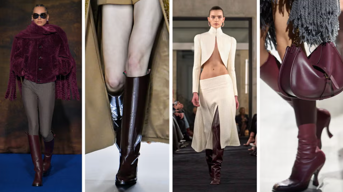 Sắc đỏ rượu vang tiếp tục nổi bật trong mùa này nhờ chiều sâu màu sắc và khả năng phối đồ linh hoạt. Burberry, Gucci và Alaia đều ưu ái những tông oxblood và merlot đậm, phối cùng camel, xám than và trắng mùa đông, cho thấy gam màu này hòa hợp tự nhiên đến mức nào trong một tủ đồ trung tính. Đây là cách đơn giản để thêm chút ấm áp và chiều sâu cho trang phục khi đen hoặc nâu trở nên quá quen thuộc.