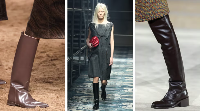 Tại các thương hiệu thời trang nổi tiếng như Hermès và Chanel, những đôi boots cao cổ bằng da cứng cáp được kết hợp cùng váy lụa mềm và các lớp len họa tiết, tạo nên sự đối lập đầy tinh tế. Trong khi đó, Prada mang đến hình ảnh những đôi boots bóng bẩy cao đến gối, phối cùng váy len phom điêu khắc, vừa thanh lịch vừa mạnh mẽ.