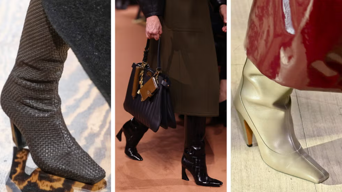 Boots mũi nhọn dáng dài gợi lại tinh thần thập niên 90, nhưng phiên bản năm nay sắc sảo và tối giản hơn hẳn. Bottega Veneta và Fendi tạo điểm nhấn bằng phần mũi vuông kéo dài, giúp đôi chân trông thanh thoát hơn và tạo đường cắt mạnh mẽ xuyên qua những lớp trang phục mùa đông dày dặn.