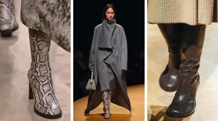 Mùa này, sự xuất hiện dày đặc của họa tiết da rắn đã khẳng định nó như một tông trung tính kiểu mới. Các nhà thiết kế đặc biệt ưa chuộng những gam xám, taupe và nâu. Những màu sắc này đủ trầm để hòa vào bảng màu mùa đông nhưng vẫn tạo điểm nhấn khác biệt.