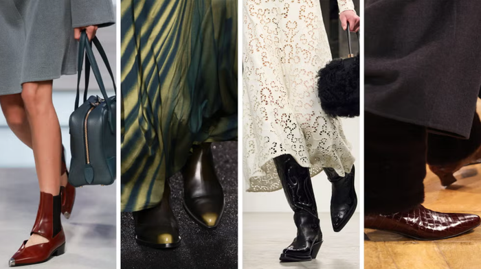 Những đôi boots lấy cảm hứng từ phương Tây xuất hiện trở lại với diện mạo hiện đại và tinh giản hơn. Louis Vuitton và Gabriela Hearst ưu ái các đường cắt gọn gàng, gót nghiêng nhẹ và bề mặt tối giản, phối cùng chân váy xếp pli, váy ren hay áo khoác may đo để tạo nên vẻ thanh lịch đương đại.