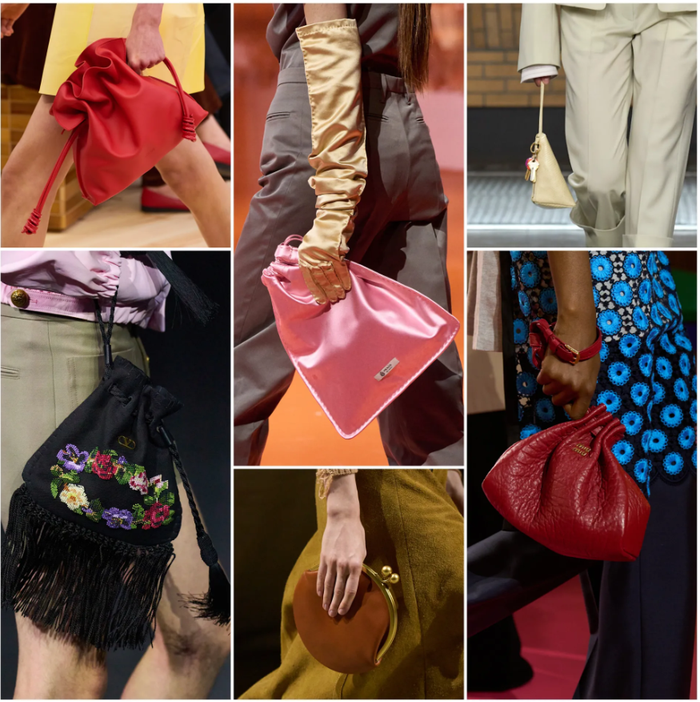 Prada đã trình làng loạt túi rút dáng dài bằng satin với các gam màu hồng phấn, tím lavender và vàng cúc vạn thọ. Sự xuất hiện dày đặc của thiết kế này trên sàn diễn nhanh chóng cho thấy túi pouch sẽ trở thành một trong những xu hướng nổi bật của mùa Xuân 2026.