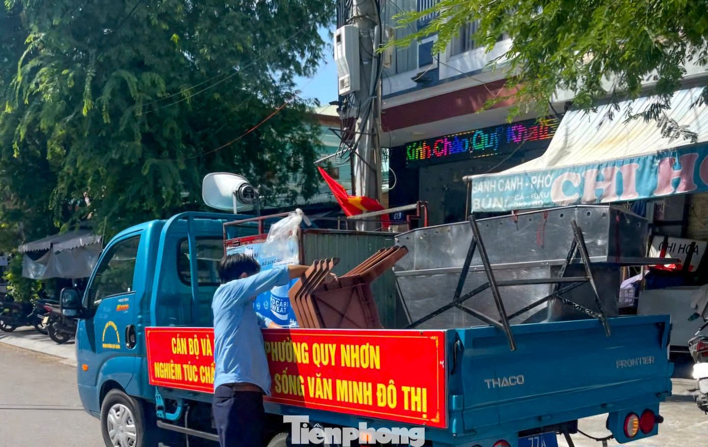Lực lượng chức năng phường Quy Nhơn ra quân xử lý lấn chiếm vỉa hè, lòng đường. Ảnh: Trương Định