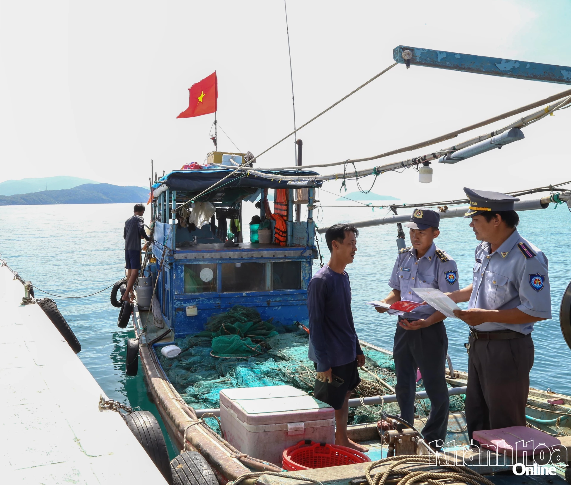 Lực lượng kiểm ngư địa phương kiểm tra, hướng dẫn công tác chống khai thác IUU đối với lao động trên tàu cá.