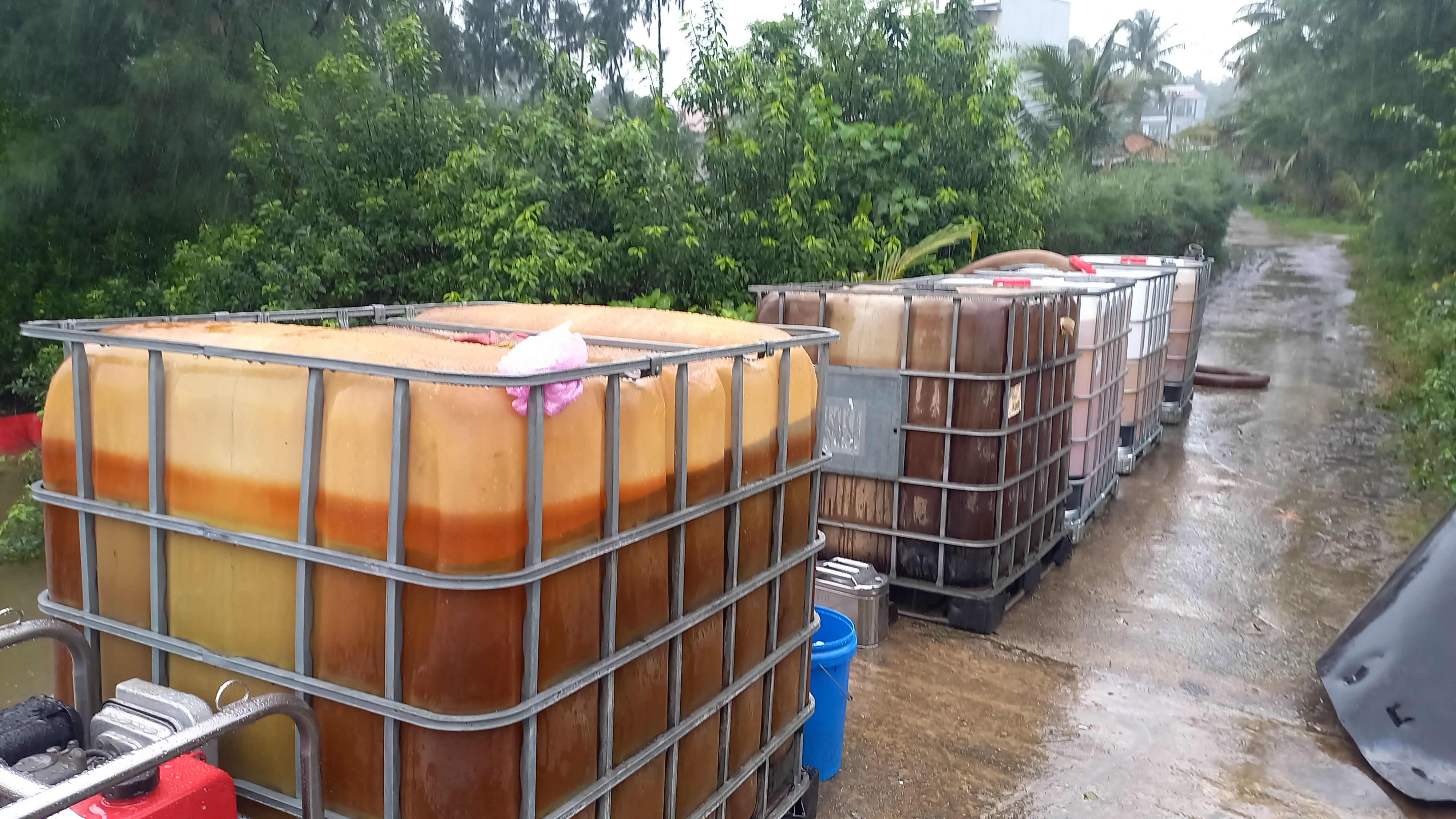 Dầu được gom vào các thùng chứa. Ảnh: NGUYỄN TRANG