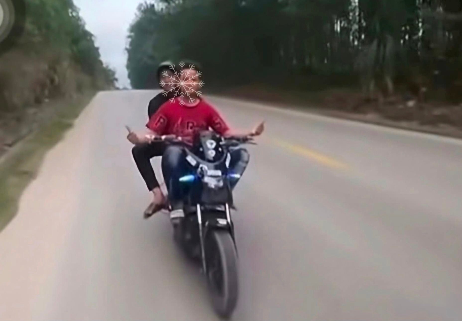 Trong clip, nam thiếu niên không đội mũ bảo hiểm, chở theo bạn phía sau và thản nhiên buông cả hai tay khi xe đang chạy tốc độ cao.