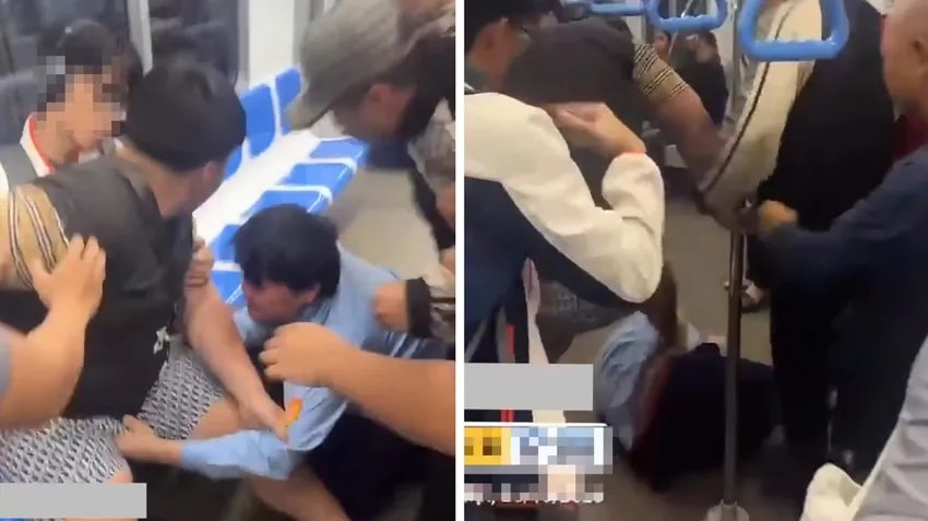 Hai đối tượng đã hành hung nam bảo vệ trên tàu metro số 1. Ảnh cắt từ clip do hành khách ghi lại