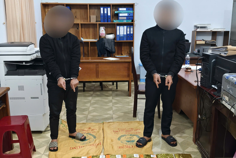 Các đối tượng bị Công an xã Quảng Khê bắt giữ để điều tra hành vi vận chuyển pháo nổ trái phép
