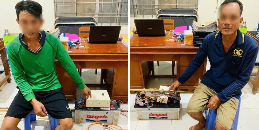 Hai đối tượng sử dụng xung điện đánh bắt thủy sản bị công an bắt giữ. (Ảnh: CACC)