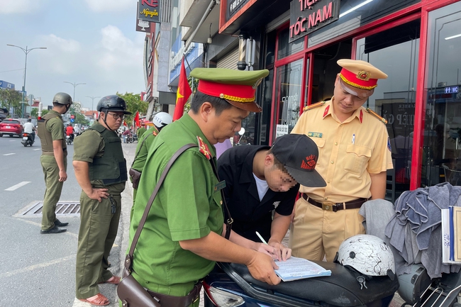 Đến 9 giờ 20, cảnh sát tiếp tục lập biên bản anh N.D.K (32 tuổi, ngụ TP Cần Thơ) do đỗ xe máy không biển số kéo theo vật khác ở lòng đường gây cản trở giao thông trên đường Lê Văn Việt, đoạn đối diện đền Bến Nọc.