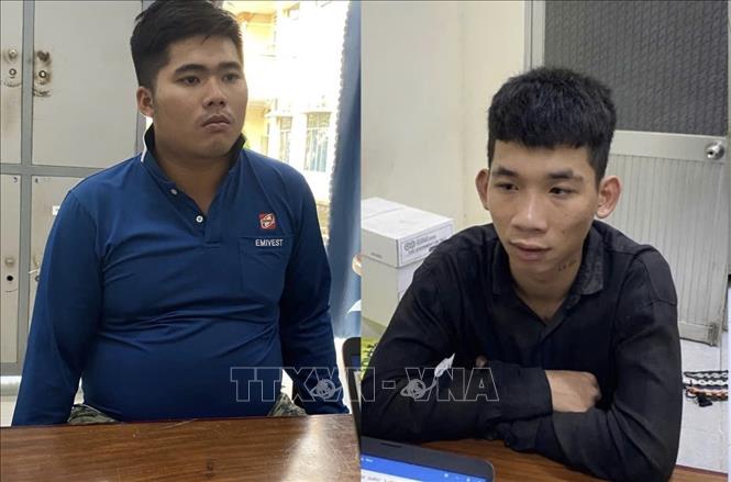 2/4 đối tượng (từ trái sang) gồm: Trần Thanh Sang, Nguyễn Lệ Nguyên tại cơ quan điều tra. Ảnh: TTXVN phát