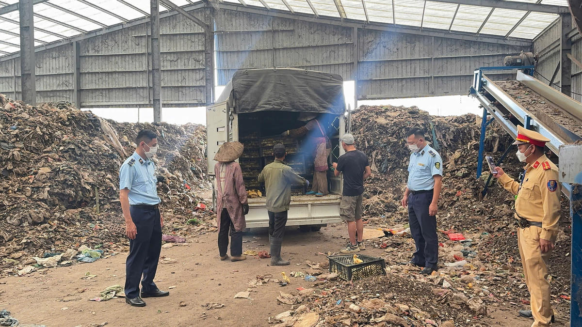 Tại hiện trường, cơ quan chức năng kiểm tra trên các thùng carton không có thông tin thể hiện nguồn gốc, xuất xứ của hàng hóa, nhiều thùng có dấu hiệu rò rỉ nước, bốc mùi hôi thối.