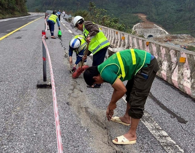 Nguyên nhân ban đầu được xác định, trong thời gian vừa qua do ảnh hưởng của cơn bão số 12 gây mưa lớn kéo dài, mặt đường xuất hiện vết nứt mới có nguy cơ mất an toàn giao thông.