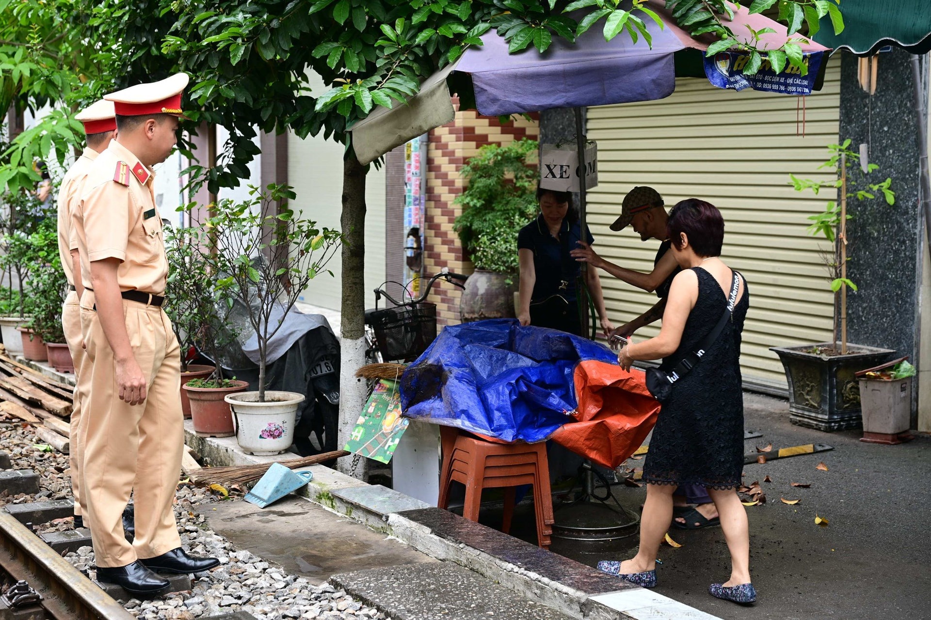 Đội CSGT số 1 yêu cầu người dân tháo dỡ lều bạt dựng trái phép lấn chiếm hành lang đường sắt.