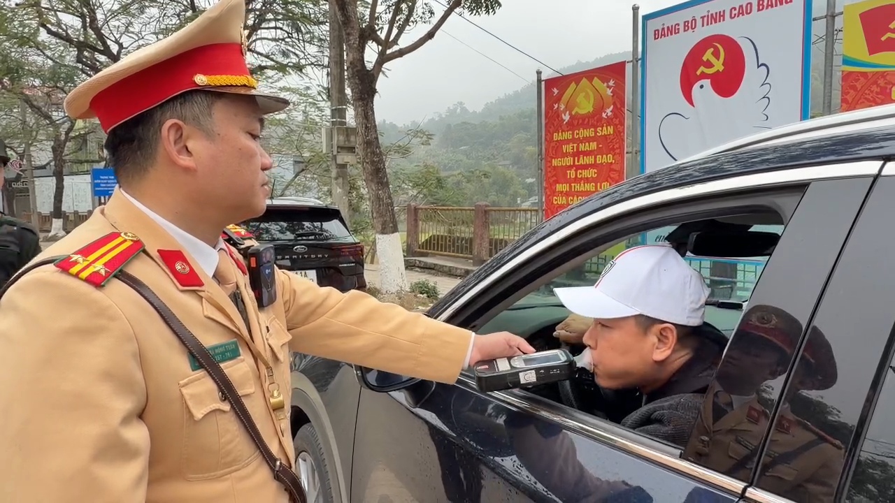 Lực lượng CSGT kiểm tra nồng độ cồn trên tuyến Quốc lộ 34B, đoạn qua phường Nùng Trí Cao.