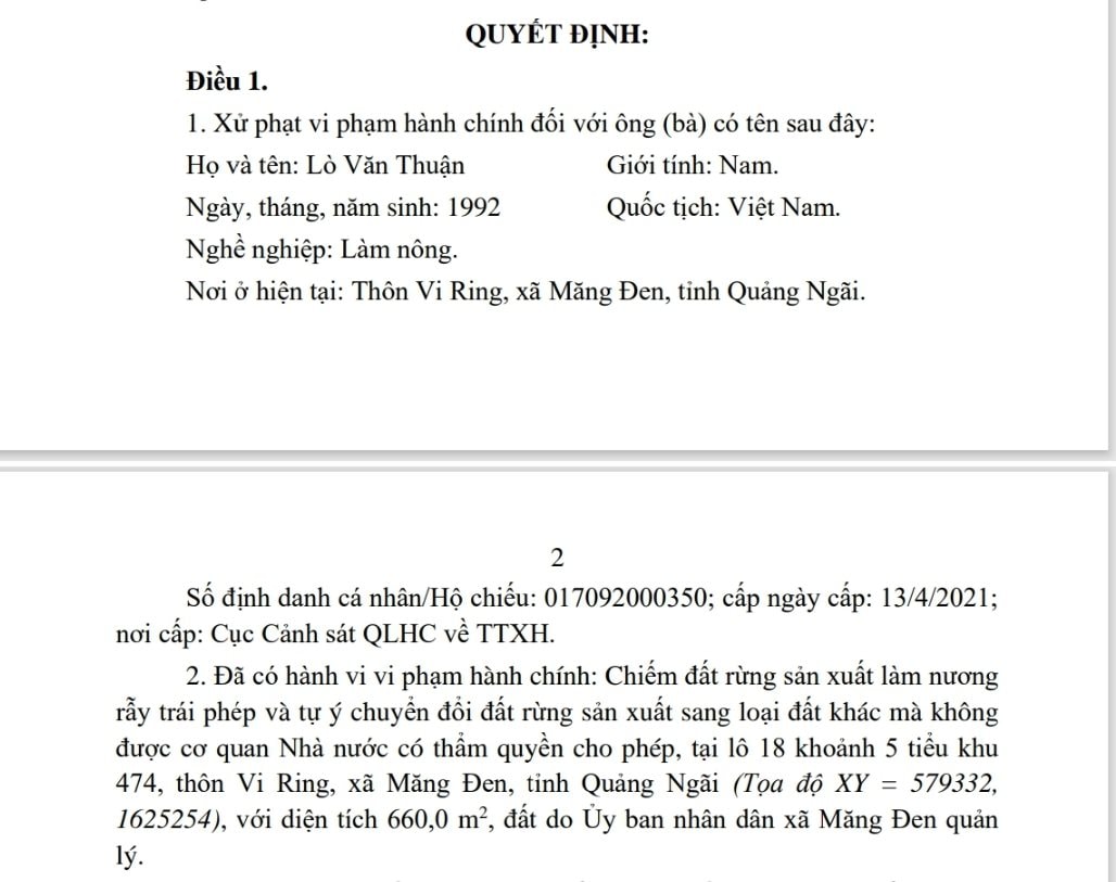 Quyết định xử phạt đối với ông Lò Văn Thuận.