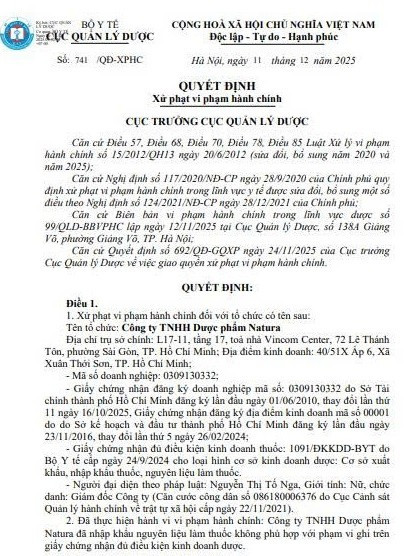 Ngày 11/12/2025, Cục Quản lý Dược (Bộ Y tế) vừa ban hành Quyết định số 741/QĐ-XPHC về việc xử phạt vi phạm hành chính đối với Công ty TNHH Dược phẩm Natura.