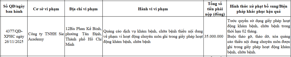 Cụ thể, Công ty Sie Academy có địa chỉ tại12 Bis Phan Kế Bính, phường Tân Định, TP Hồ Chí Minh bị xử phạt 35 triệu đồng và tước quyền sử dụng giấy phép hoạt động khám bệnh, chữa bệnh trong thời hạn 02 tháng; Buộc tháo gỡ, tháo dỡ, xóa quảng cáo thiếu nội dung chuyên môn được ghi trong giấy phép hoạt động khám bệnh, chữa bệnh.