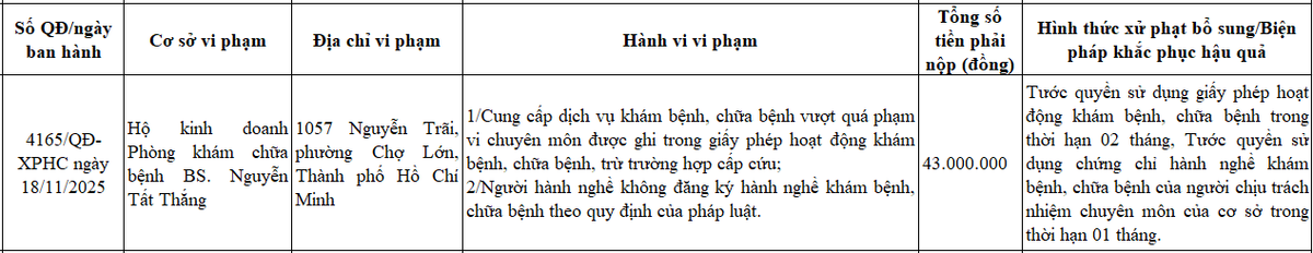 Hộ kinh doanh Phòng khám chữa bệnh BS. Nguyễn Tất Thắng (1057 Nguyễn Trãi, phường Chợ Lớn, TP Hồ Chí Minh) bị Sở Y tế TP Hồ Chí Minh xử phạt 43 triệu đồng.