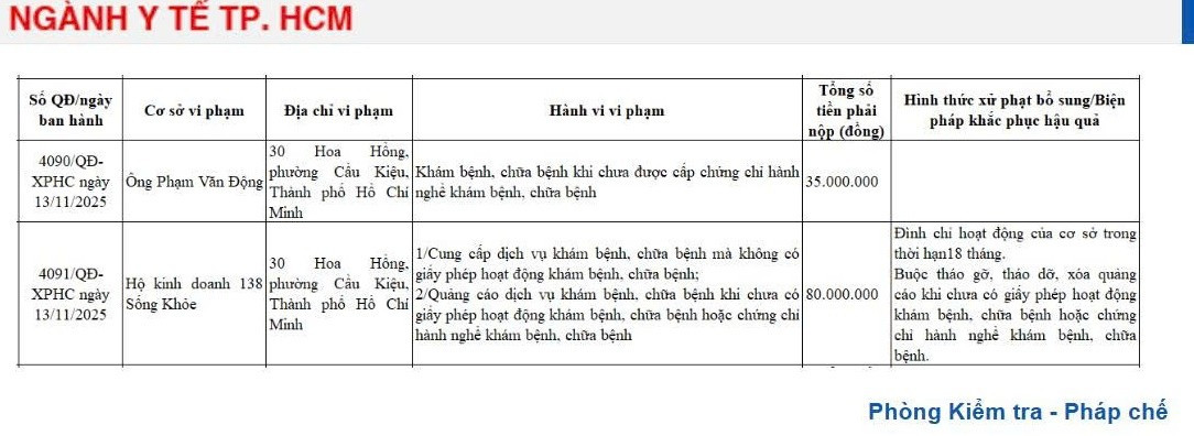 Ngày 2/12, Sở Y tế TP Hồ Chí Minh công khai Quyết định số 4091 QĐ-XPHC ngày 13/11/2025 về việc xử phạt vi phạm hành chính trong lĩnh vực y tế đối với Hộ kinh doanh 138 Sống Khỏe.