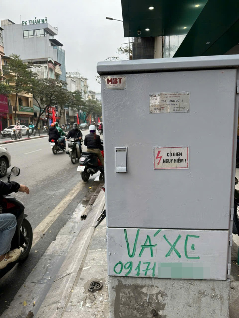 Trụ điện bị vẽ, viết bằng sơn quảng cáo dịch vụ vá xe