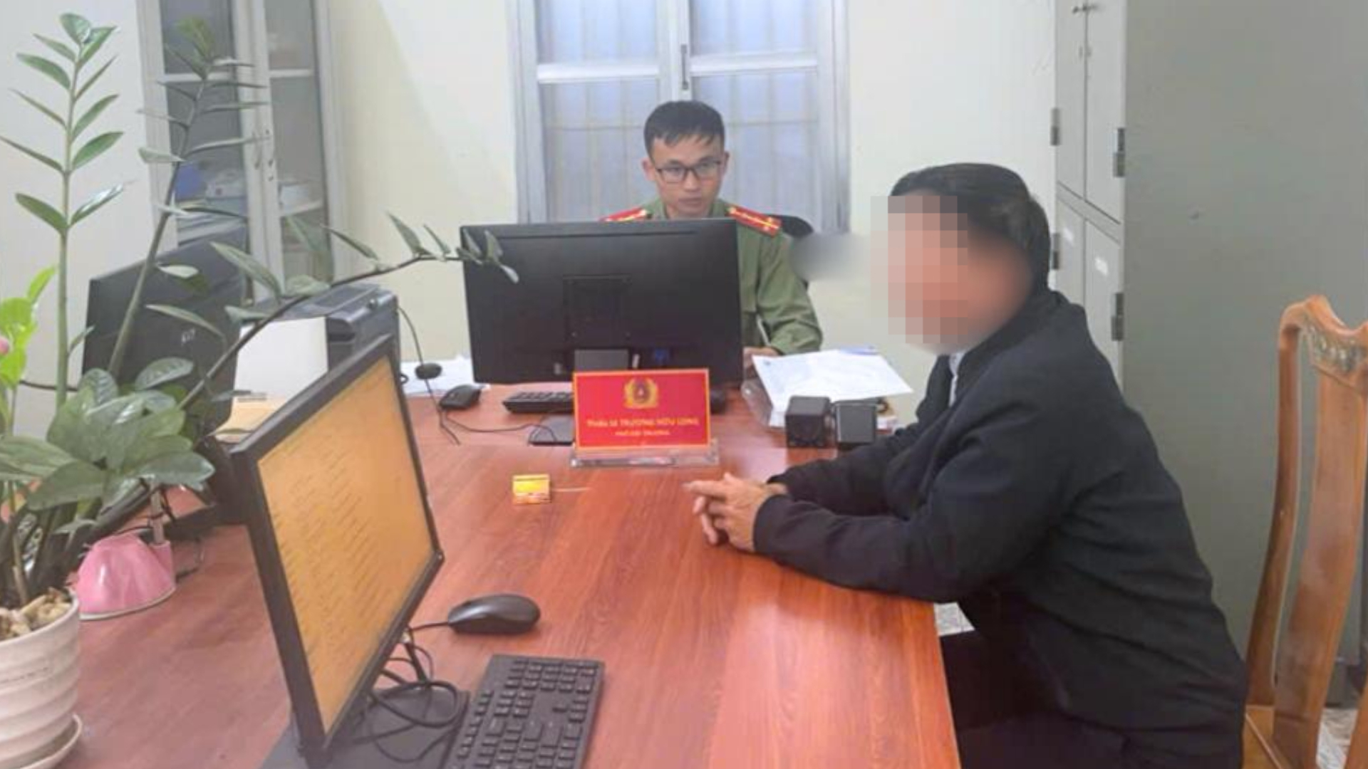 Cán bộ công an làm việc với ông C. Ảnh: Công an Hà Tĩnh