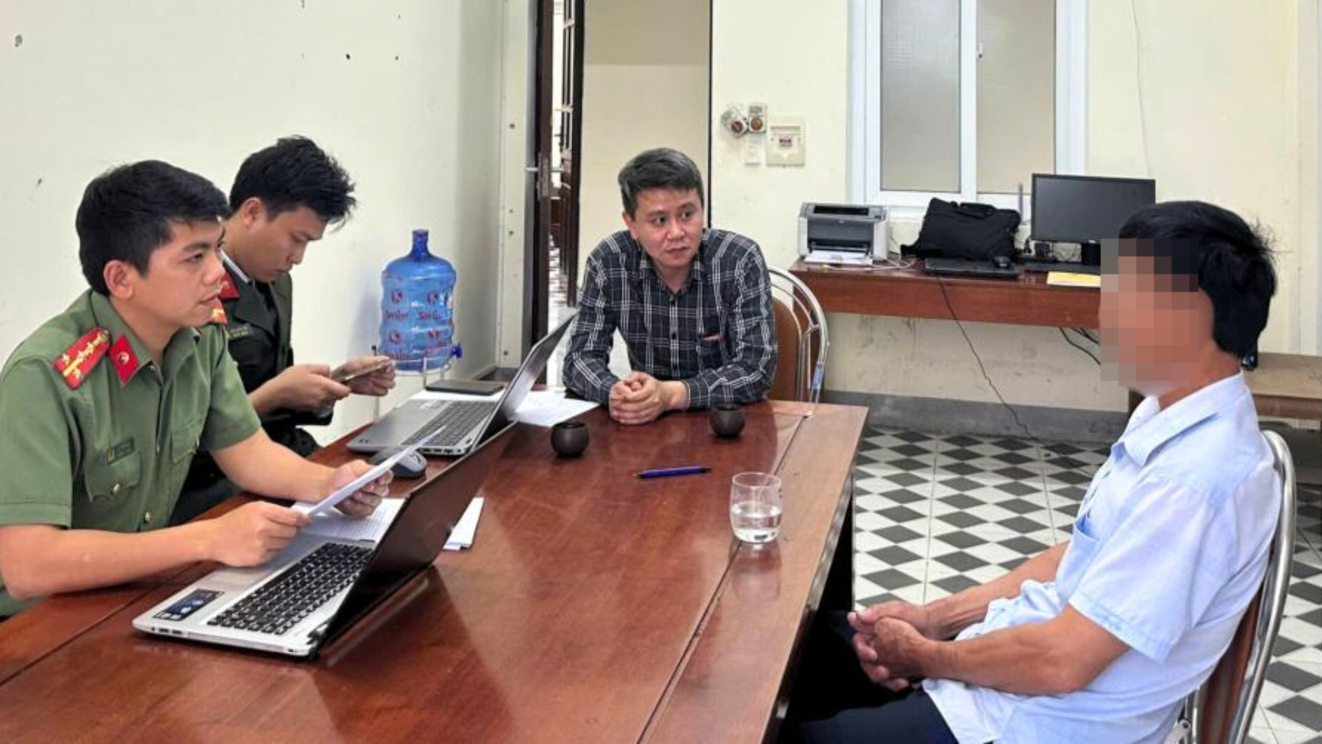 Cán bộ Phòng An ninh mạng và phòng chống tội phạm sử dụng công nghệ cao Công an tỉnh Hà Tĩnh làm việc với ông T. Ảnh: Công an tỉnh Hà Tĩnh